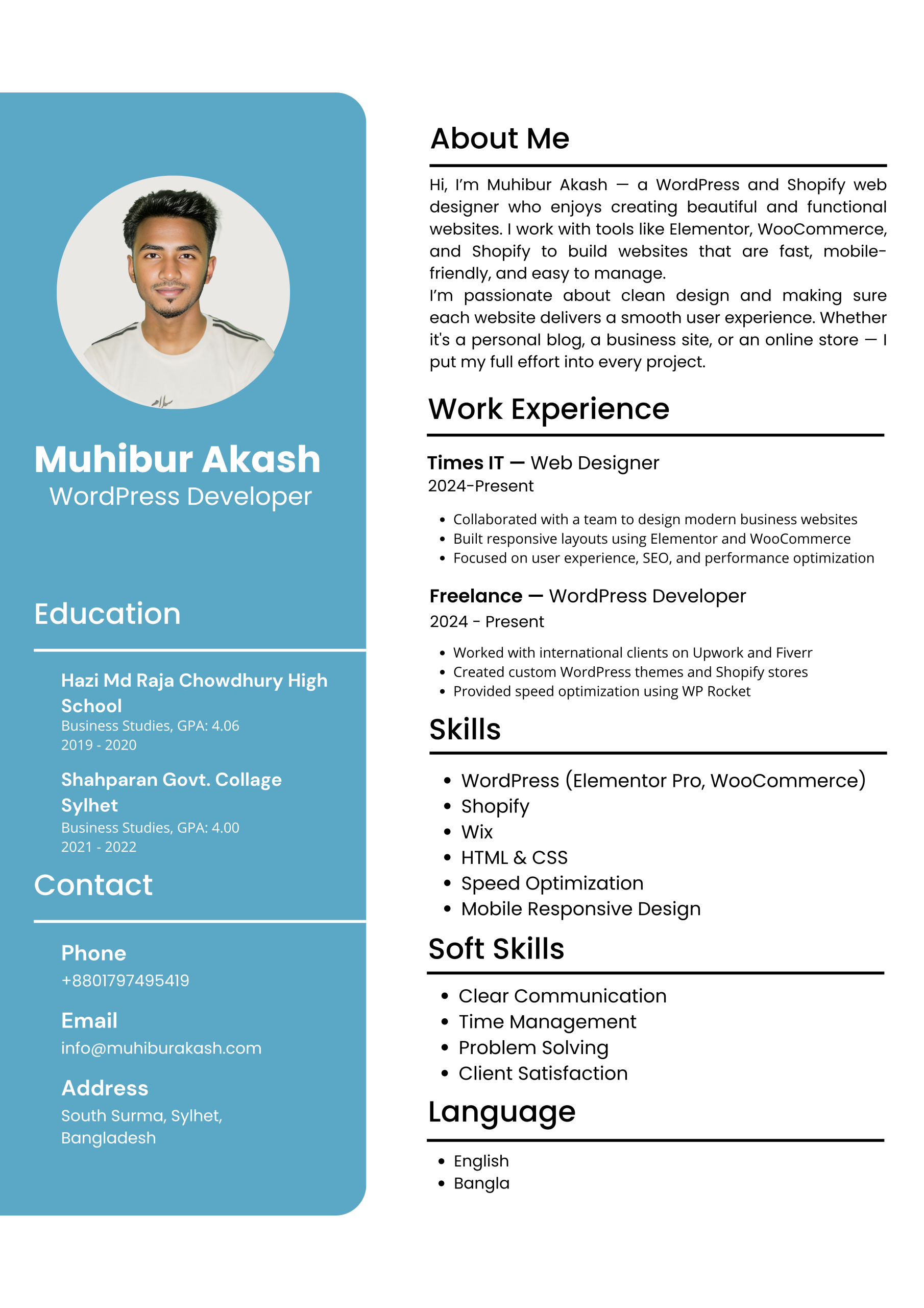Hi, I’m Muhibur Akash, a WordPress and Elementor expert focused on creating modern, responsive, and user-friendly websites. I’ve helped startups and small businesses build fast, mobile-optimized, and SEO-friendly sites that deliver real results. Combining creative design with strong functionality, I bring your vision to life with clear communication, attention to detail, and timely delivery. Let’s work together to create something impactful that grows your brand online!
